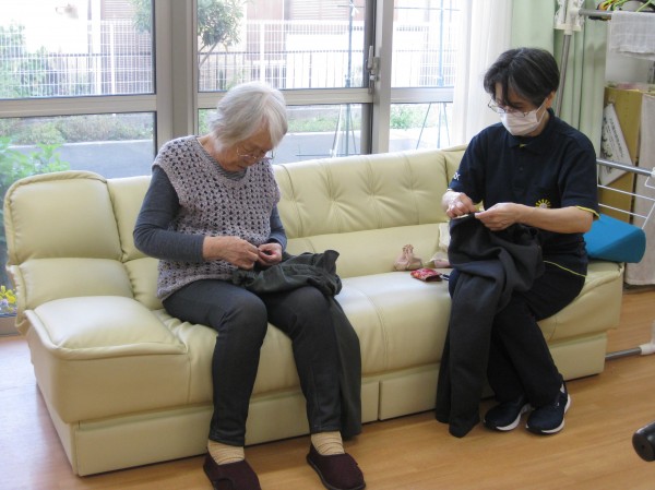 職員の見守りの下、ズボンのほつれた所を縫っているご様子です!! 指ぬきがないと縫いずらいね~と仰りながら縫って下さいました( ^ω^)・・・ 綺麗です!! ありがとうございました。