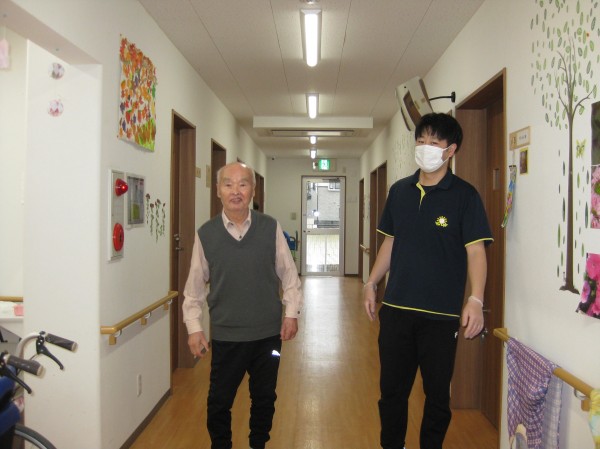 おしゃべりをしながら廊下を歩いています。歩かなくちゃねと楽しまていました!!『あら、もう田んぼに苗を植えたんだね!早いんだね!』と懐かしそうに話されていました!(^^)! 笑顔が素敵ですね( ^ω^)・・・