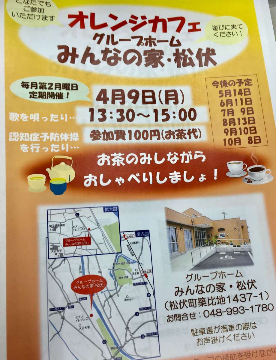 4/9オレンジカフェ開催予定です(^o^)五感に働き掛けるような催しものを取り入れお好きなお飲み物とちょっとしたお菓子を召し上がりながらワイワイ過ごせるカフェです(^o^)認知症や入居などのご相談、ボランティアや職員で働きたいと求人も募集してるので雰囲気を感じれますからお気軽にお越しください(╹◡╹)
