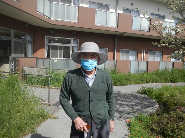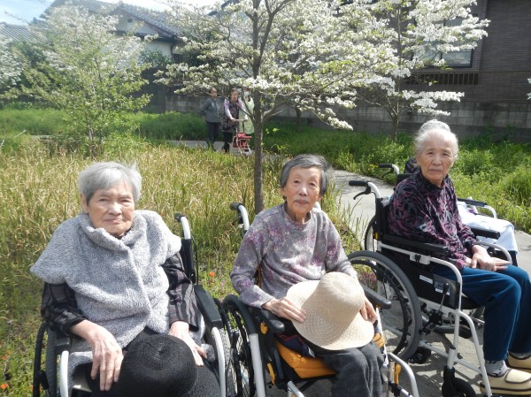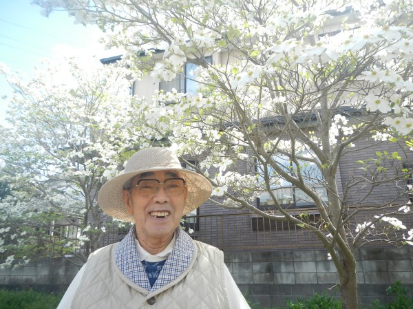 この日も、みんなで中庭へ出て、白く咲き誇るハナミズキ(花水木)を鑑賞しながら、外気浴を楽しみました。