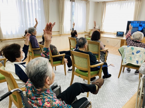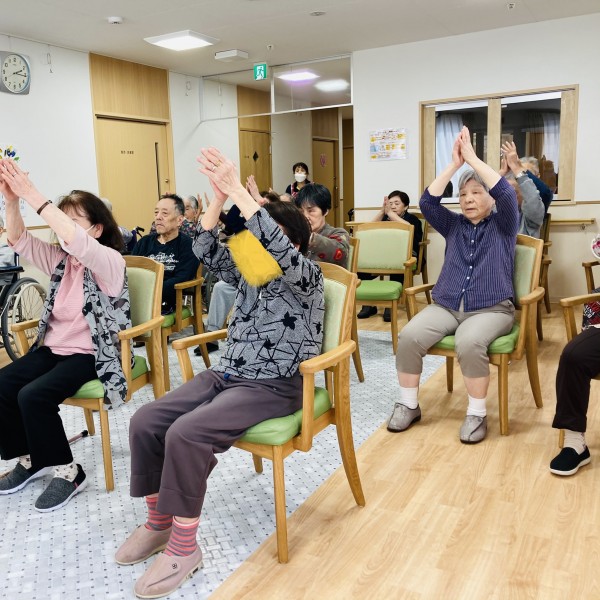 皆さん声を出しながら手拍子をしたり、腕も足もしっかりあがります!毎日フロアで行う体操と違い、他のフロアの皆さんと一緒に参加するので、賑やかな雰囲気でとても楽しい時間になっています♪