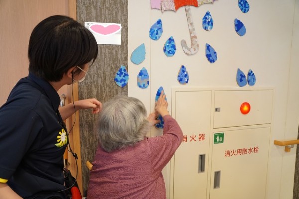 今回は、前回の作成途中だった「梅雨‼」を表現した可愛いパラソルや雨粒を壁に飾り付けをいたしましたぁ\(^^)/