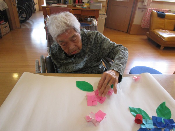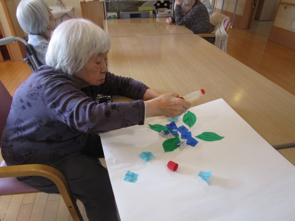 ご利用者様と一緒にアジサイの壁飾りを作りました。
