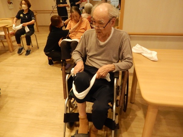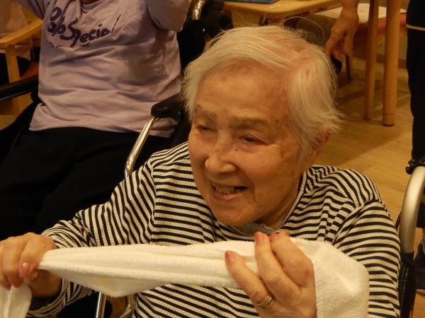 ご利用者さま、お一人ずつタオルを持って~、「イッチニー!イッチニー~‼」