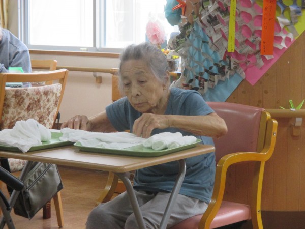 黙々と、おしぼりを作ってくれます(^^♪。まだ入居して、まもない為、施設の生活に慣れるまでは、色々と大変だと思いますが、楽しく生活していただけるように、支援していきたいと思います(^^♪。宜しくお願い致します。