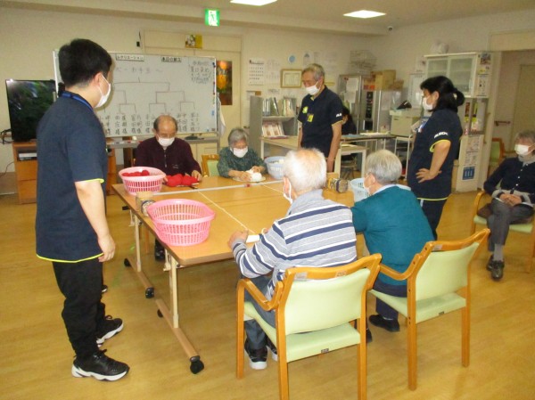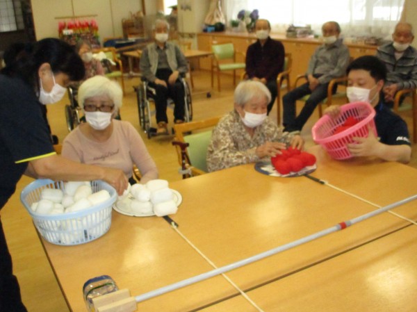 こんにちは!デイサービスセンター遊・西東京です。本日の運動レクレーションは『リンボーお手玉』です。