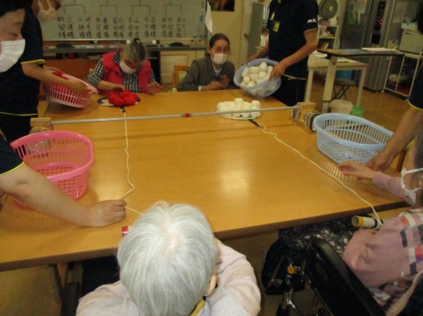 2人1チームのグループ対グループの競争です。テーブルの上にある紐のついた内輪に赤白分れてお手玉を載せ、真ん中にある横棒に引っかかって