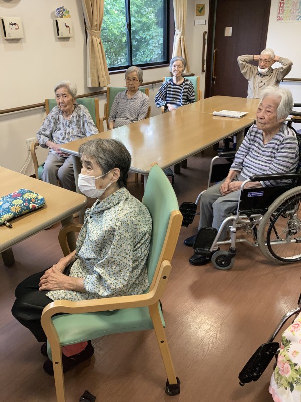 2階の入居者様は身体を動かすのが大好きで、リモート体操の先生のお顔をみると