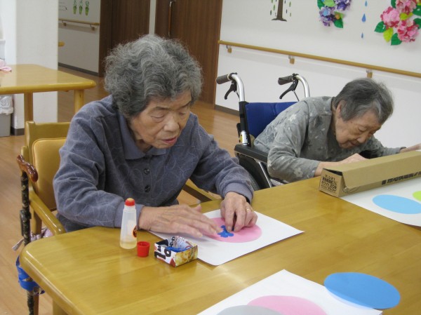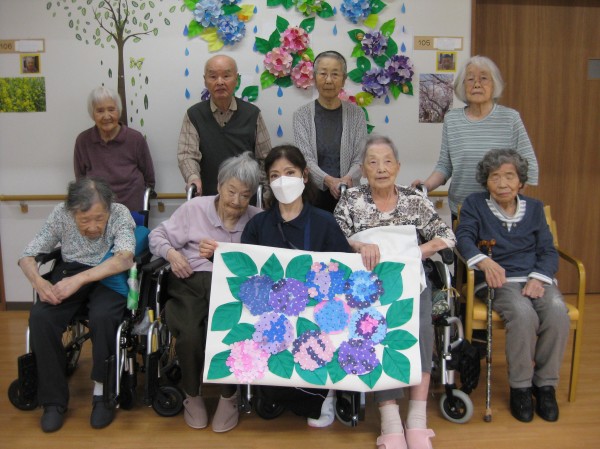 こんにちは!グループホームみんなの家・あきがせの介護ブログです!よろしくお願いいたします。今日は6月お花「あじさいの花」の貼り絵をした時の様子をご紹介します!!