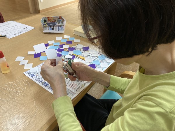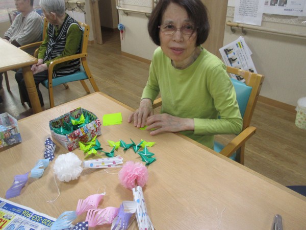 折り紙を折ったり、貼ったりして、新しい飾りを作っていただいています。