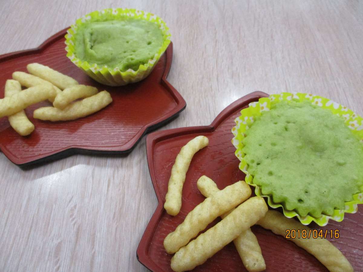 今日のおやつは手作りの「つぶあん入り抹茶蒸しパン」でした♪