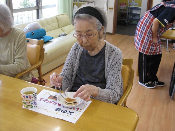 職員がおやつ作りで「どら焼き」を作っている様子です。 美味しいと完食されています( ^ω^)・・・