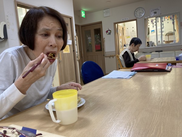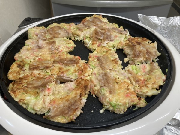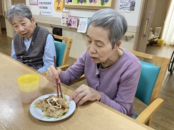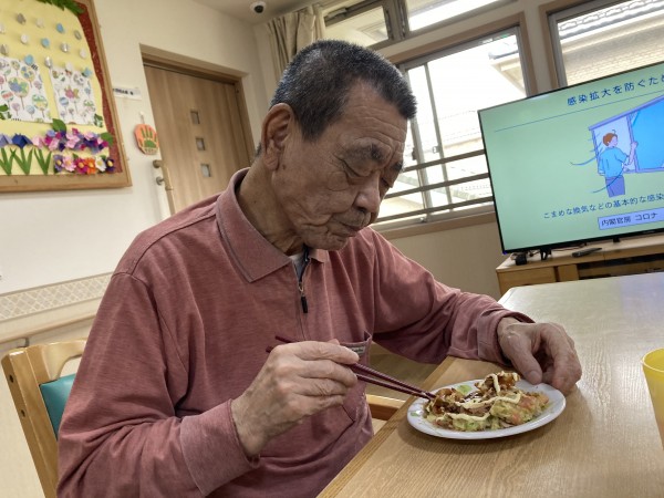 おやつにお好み焼きを作り、召し上がっていただきました。