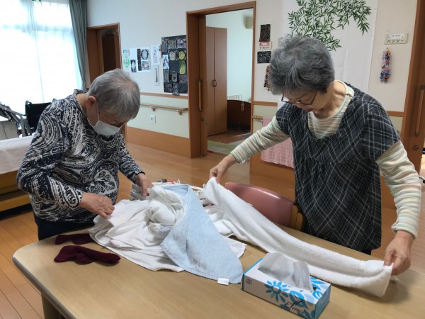 2階のフロアに上がったところ、ご利用者様が洗濯物を畳んでくださっていました。