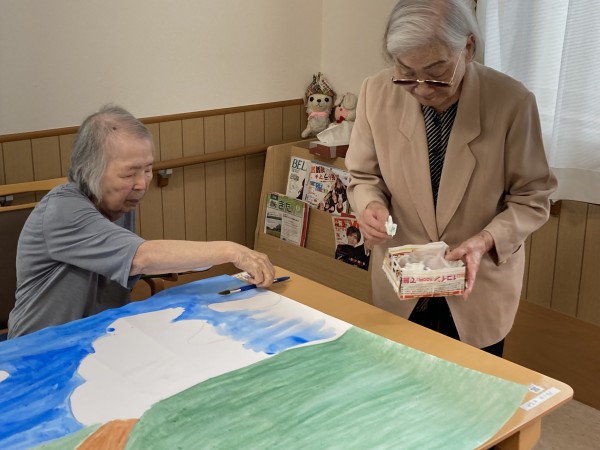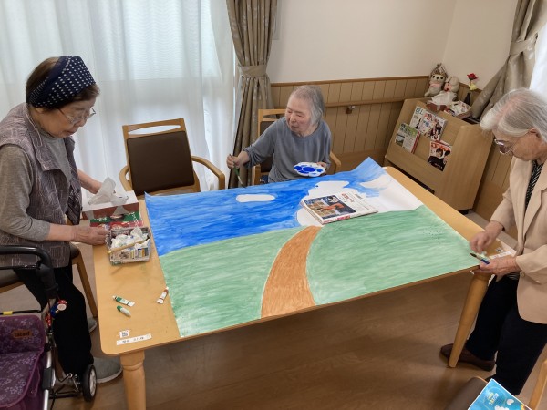 職員で下書きをさせて貰い、その下書きに入所者様に絵具で色を塗って頂きました。