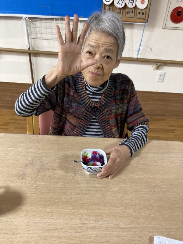 杏仁豆腐を器に乗せ、冷えた寒天ゼリーで、はい「紫陽花ゼリー」の出来上がり!