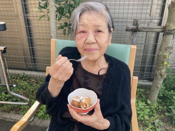 ホームでは梅雨明け前に玄関前でお茶会をしましたよ~(^^♪