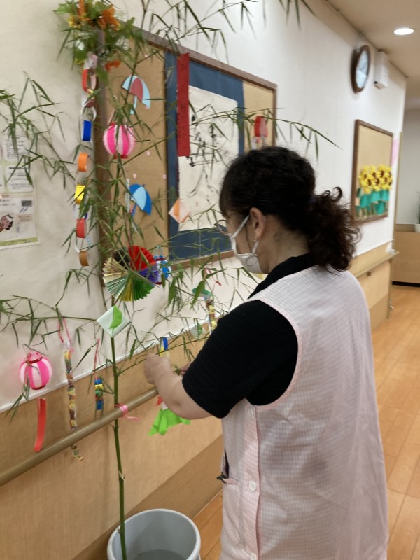先日 七夕飾りを笹に飾り付けをして 今回は 入居者様に 短冊に願い事を書いてもらいました