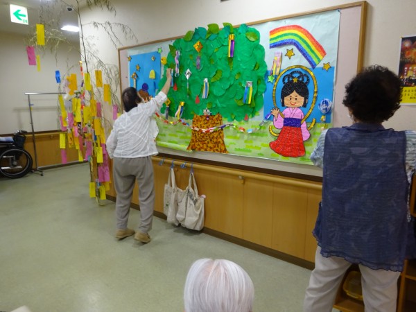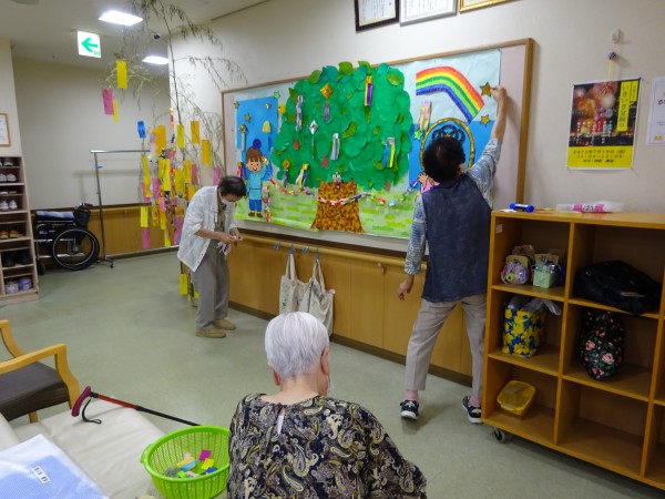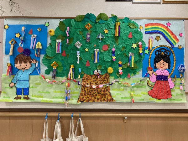 ご利用者様が貼り絵をしてくれた彦星様と織姫様を輪飾りでつなぎ、飾りは皆様が協力して貼ってくださりました(^^)/