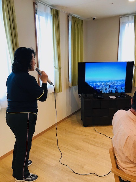お客様が数曲当たった後は、事業所職員の中で一番の歌唱力を持つケアマネさんに急遽一曲リクエストしました。