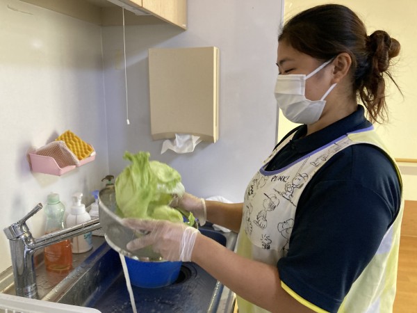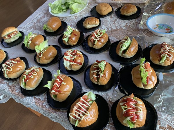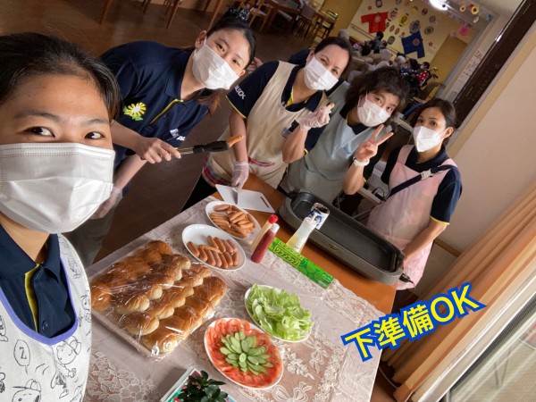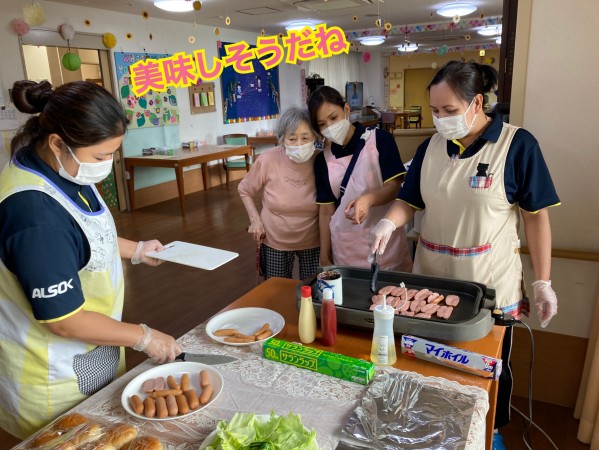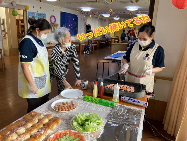 黒木ケアスタッフが焼いたソーセージを野菜と一緒にパンに挟む三上ケアスタッフ。