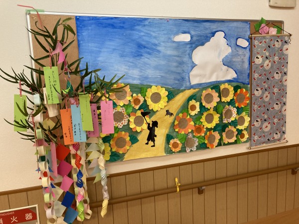 完成した短冊は先月一緒に作った壁紙と飾らせて頂きました。