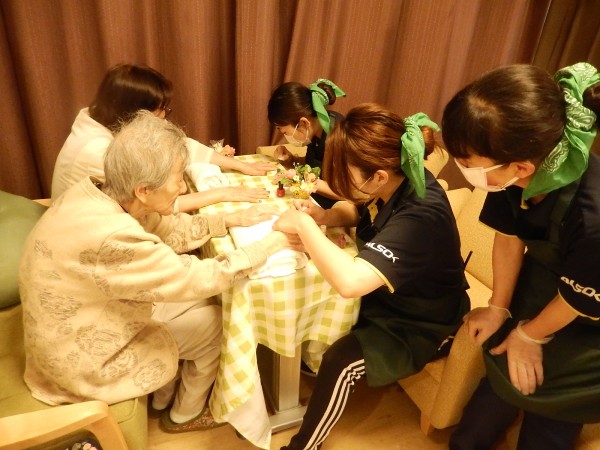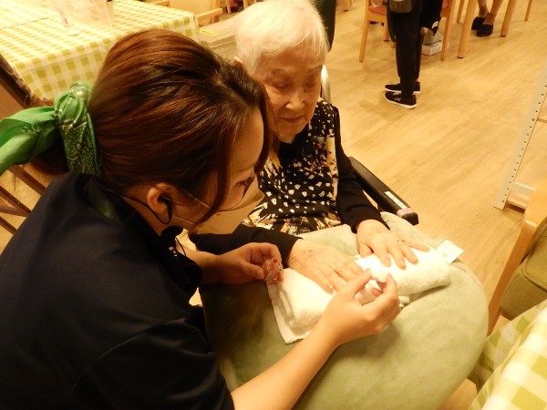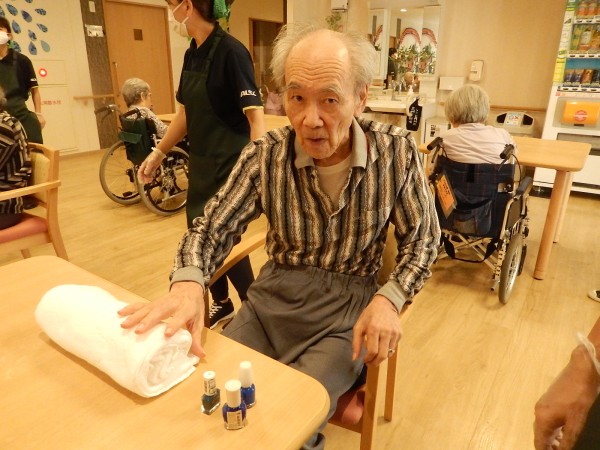 皆さんの楽しい雰囲気や会場のムードで、男性ご利用者さまがネイルにとても興味を持たれ、「どうしてもしてネイルを欲しい!」、と(^▽^;)