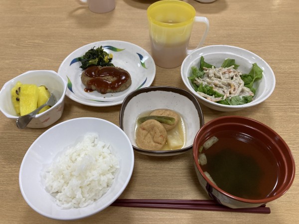 メニューは、ごはん、すまし汁、ハンバーグ、豆乳がんも煮、ごぼうサラダです。