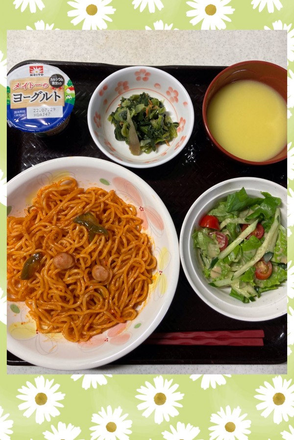 15日の昼食!ナポリタンとシャキシャキリーフレタスのサラダがとっても美味しそうです(´~`)モグモグ♡
