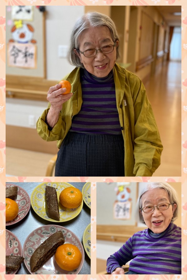 本日のおやつは~甘ーい黒糖棒と可愛いミカンです!とっても綺麗なみかん(o^―^o)ニコ美味しいわね!っと喜ばれました(*^▽^*)