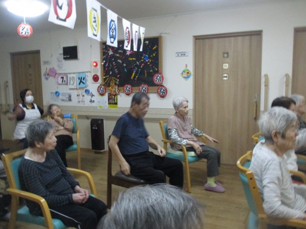 リモート盆踊りの前にホーム手作りのお神輿を皆様に担いでいただきました。