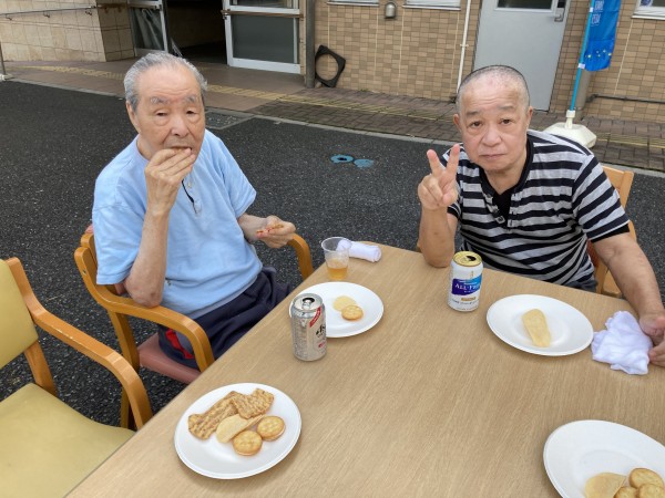 施設の前に集まり、外気浴をしながら、