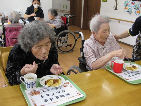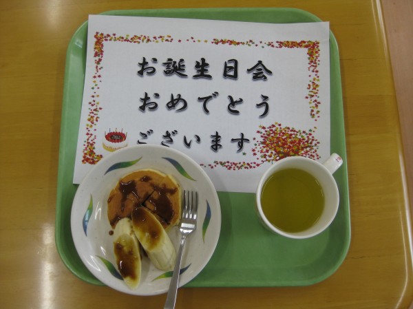手作りホットケーキでお祝いをしました。歌を合唱し楽しいひと時を過ごしました( ^ω^)・・・ ホットケーキ美味しかった!!と喜ばれていました!(^^)!