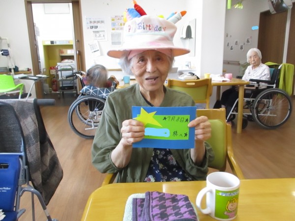 お誕生日おめでとうございます! 7月は1名の方です。記念写真を撮り歌を歌いお祝いを行いました( ^ω^)・・・ 『これからも元気に頑張ります!』と話されました。 本当におめでとうございます! いつまでもお元気!!