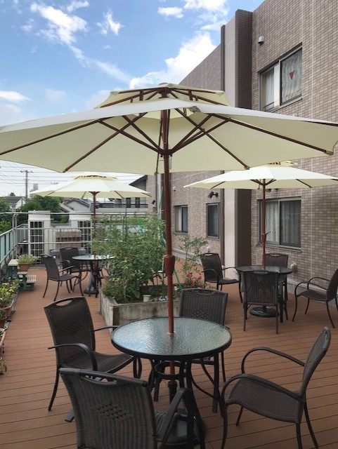 新しいパラソル付テーブル・椅子を営業Sさん・営繕Fさんが中心となって