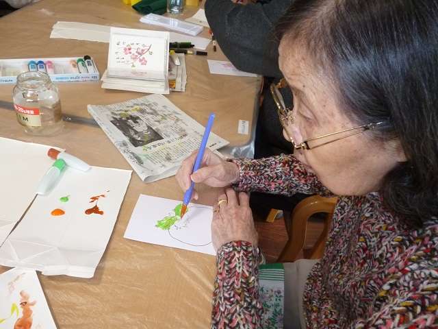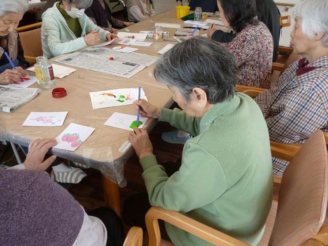 みんなの家横浜金が谷では、絵手紙レク、利用者様はじめての体験で、色とりどりの絵具でハガキに絵を描くのですが、