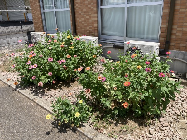 色とりどりのお花が太陽の日差しを受けて力強く咲いています。