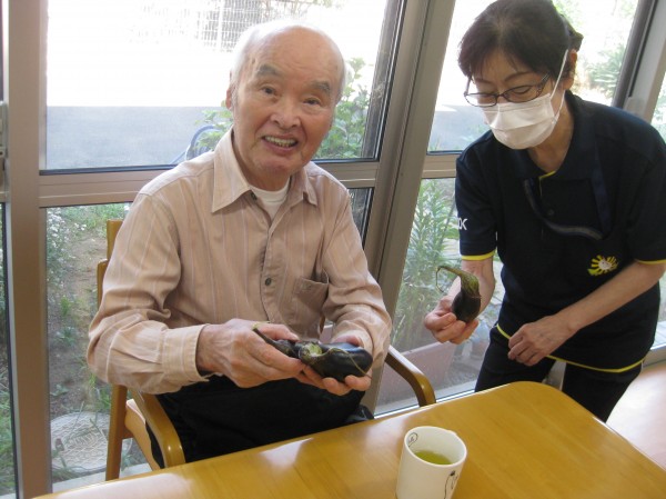 ホールから大きく育ったナスがご利用者様が発見されたので収穫しました。ナスが3ケ収穫され大きいのは食べごろだね!! 早くお味噌汁にして食べようよと仰りました( ^ω^)・・・ ナスとはつか大根の葉のお味噌を食べましょうとお伝えすると楽しまれていました!(^^)!