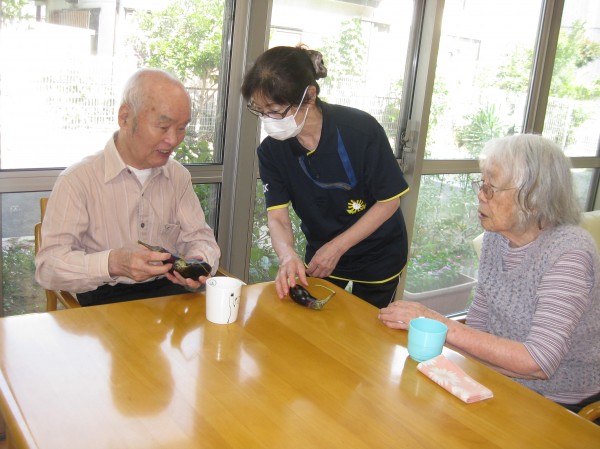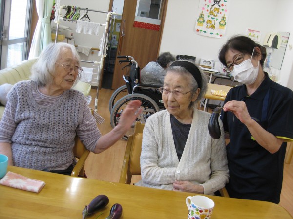こんにちは! グループホームみんなの家・あきがせの介護ブログです! 様子をお知らせいたします!! 今日はナスの収穫を行ったご様子をお知らせいたします!!
