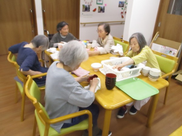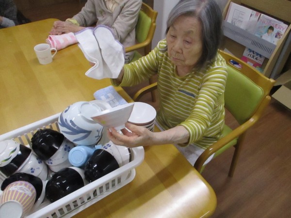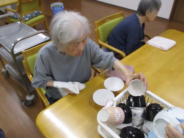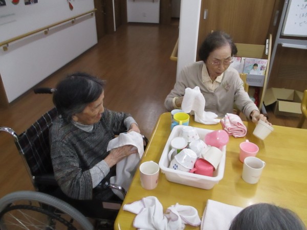 こんにちは! グループホームみんなの家・あきがせの介護ブログです! よろしくお願いいたします!! 2階でお手伝いの食器吹きのご様子をお知らせいたします。