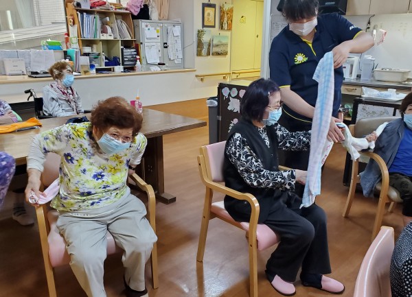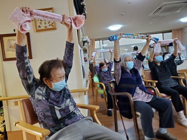 タオル体操だと気合いの入るご利用者様に負けじと、職員も前に出て頑張っています!!