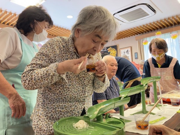スタッフが上流から水とそうめんを流し、皆様がタイミング合わせて