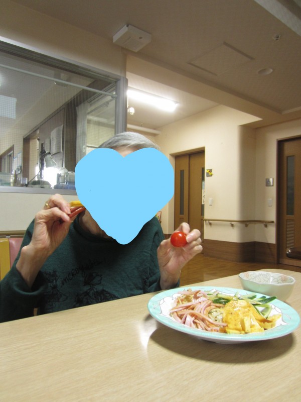 ご利用者様に「この玉子は甘くて美味しいですね。このソーセージも柔らかくて美味しいですね。」と仰っておられて、とても笑顔で真剣に召し上がっておられました。ご利用者様は「私は麺が大好きです。」と仰っていたので冷やし中華を作って良かった思いました。