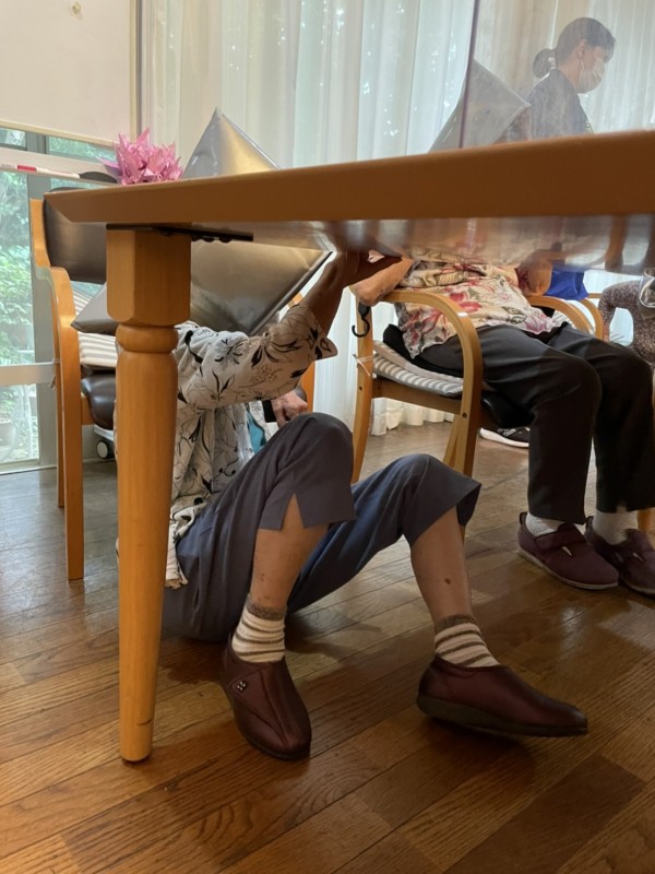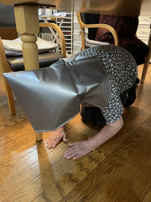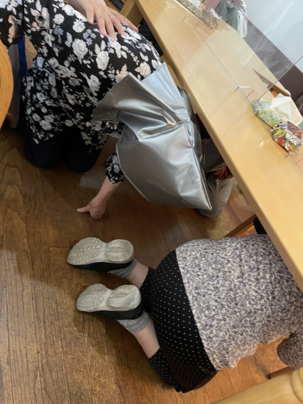 揺れがきたら、まず机の下にもぐって頭を守る。