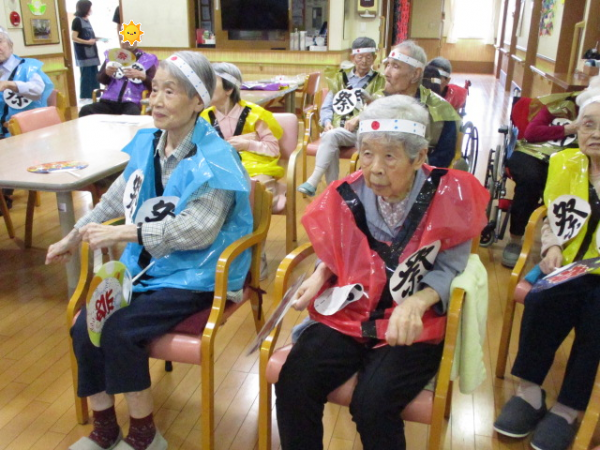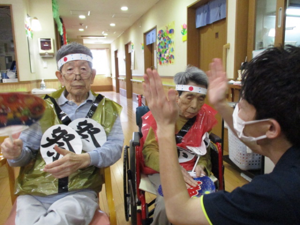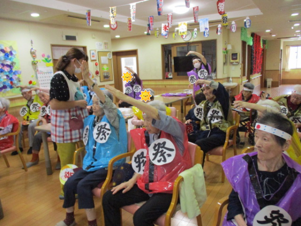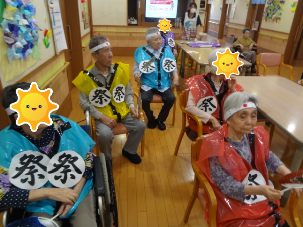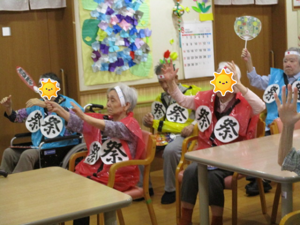 皆さま、手を大きく動かし元気に参加して下さっています!!(^O^)/ちなみに、ご利用者様が来ているハッピや手に持っているうちわはスタッフと一緒に作りました!!(*^-^*)