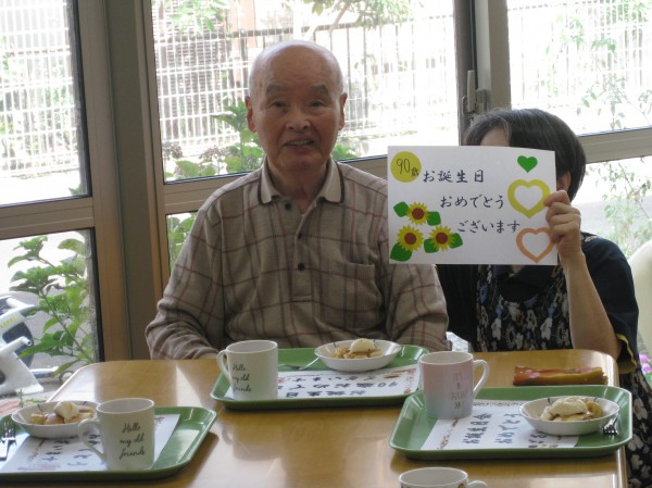 お誕生日おめでとうございます。 いつまでもお元気で楽しまれてください!! 90歳になりました。『もう90ですか? そうなんですか? 忘れちゃいましたb??』と話されました。これからもよろしくお願いします!とのことです( ^ω^)・・・ 誕生日の歌をみんなで歌いお祝いをしました!! 嬉しく涙目になっていました。ホットケーキを召し上がられ楽しいひと時をお過ごしになりました!!