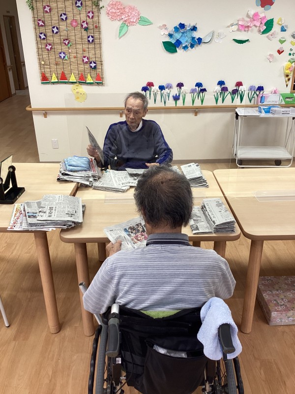毎回スタッフが作業をしていると「手伝うよ?」と仰って下さるこちらの方々は本日、日頃のケアに使う新聞を折って頂く作業を行なって下さいました♬