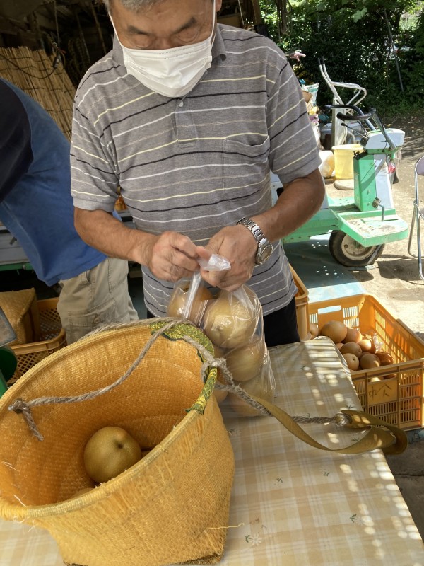 多摩川梨は多摩(たま)、幸水(こうすい)、清玉(せいぎょく)、二十世紀 (にじゅっせいき)、豊水(ほうすい)、新高(にいたか)、東京都のみで栽培される稲城(いなぎ)などたくさんの種類が栽培されていますが、このタイミングは「豊水」が潤沢に店先に並んでいました。