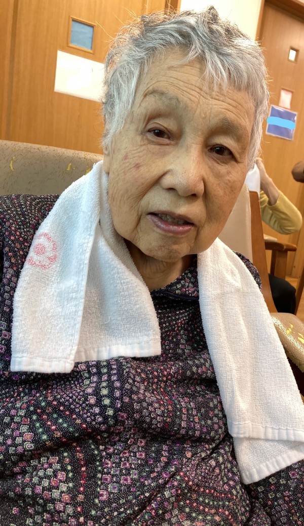 タオルを首に巻いて身体を捻じる体操の時にとある利用者様は首に巻くだけでしたが、行なってくださいました。