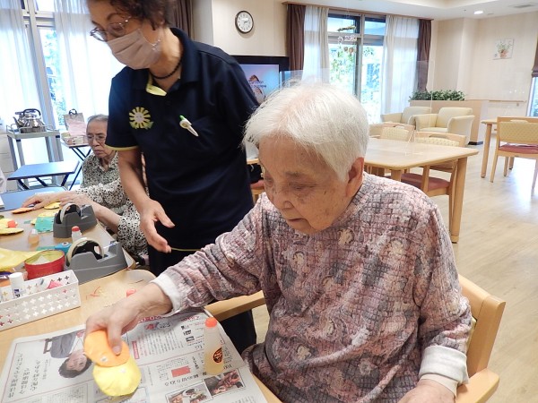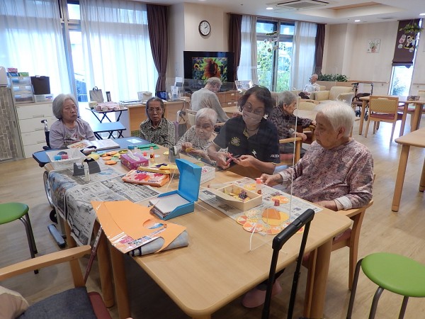 食堂の壁に、四季を感じられよう季節毎にご利用者の皆さまと一緒に紙工作して飾り付けしております(^^♪